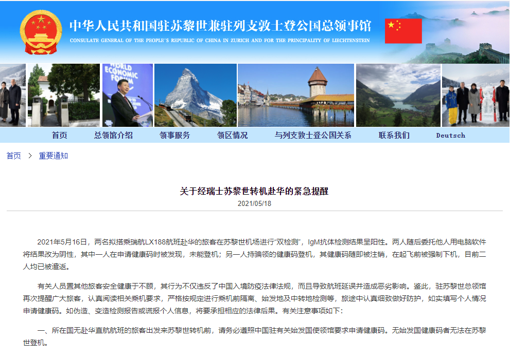 香港中通社5月18日電 當地時間5月18日,中國駐蘇黎世總領事館網站發佈關於經瑞士蘇黎世轉機赴華的緊急提醒;並披露,有2人篡改檢測結果騙取健康碼赴華已被遣返。 消息稱,2021年5月16日,兩名擬搭乘瑞航LX188航班赴華的旅客在蘇黎世機場進行“雙檢測”,IgM抗體檢測結果呈陽性。兩人隨後委託他人用電腦軟件將結果改為陰性,其中一人在申請健康碼時被發現,未能登機;另一人持騙領的健康碼登機,其健康碼隨即被註銷,在起...