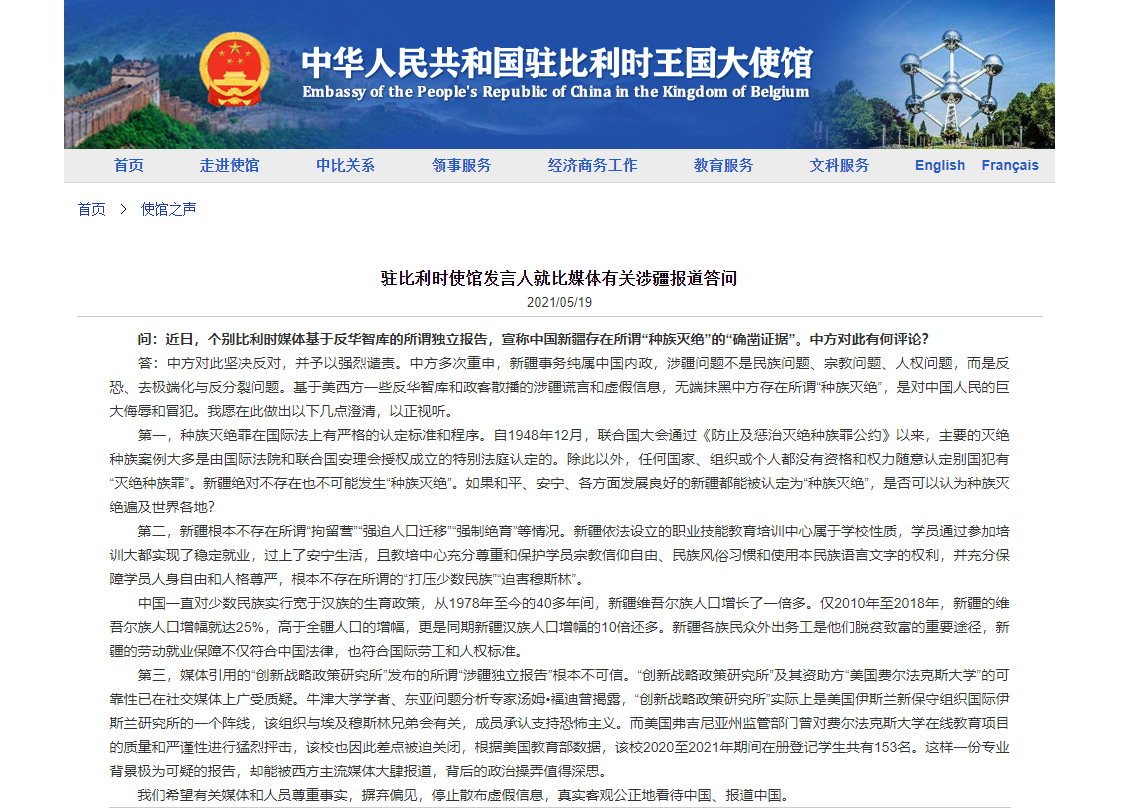 中使館回應比利時媒體報道:所謂“涉疆獨立報告”根本不可信