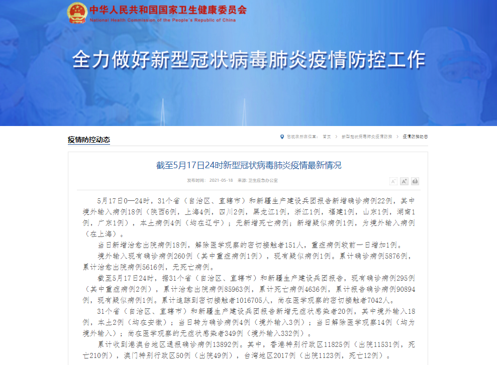 香港新聞網5月18日電 據國家衛生健康委員會官方網站消息,5月17日0—24時,31個省(自治區、直轄市)和新疆生產建設兵團報告新增確診病例22例,其中境外輸入病例18例(陜西6例,上海4例,四川2例,黑龍江1例,浙江1例,福建1例,山東1例,湖南1例,廣東1例),本土病例4例(均在遼寧);無新增死亡病例;新增疑似病例1例,為境外輸入病例(在上海)。 當日新增治愈出院病例18例,解除醫學觀察的密切接觸者151人...