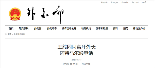 香港新聞網5月18日電 據中國外交部網站消息,2021年5月17日,國務委員兼外長王毅同阿富汗外長阿特馬爾通電話。 王毅表示,中阿戰略合作夥伴關係保持發展勢頭,兩國共建“一帶一路”合作持續進展,中阿傳統友誼在共同抗擊疫情中得到升華。中方讚賞阿方堅定支持中方維護自身核心利益,將一如既往為維護阿獨立、主權和尊嚴仗義執言。中方願同阿方一道,以今年中阿《睦鄰友好合作條約》簽署15周年為契機,推動雙方深化共建“一帶一路”...