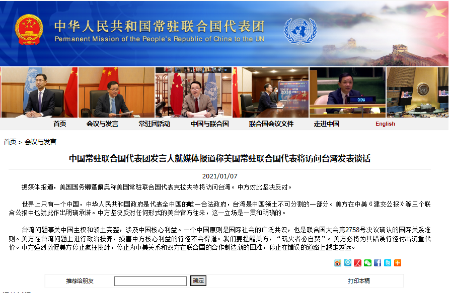 香港新聞網1月8日電 中國常駐聯合國代表團網站1月7日消息,中國常駐聯合國代表團發言人日前就媒體報道稱美國常駐聯合國代表將訪問台灣發表談話。 據媒體報道,美國國務卿蓬佩奧稱美國常駐聯合國代表克拉夫特將訪問台灣。中方對此堅決反對。 世界上只有一個中國,中華人民共和國政府是代表全中國的唯一合法政府,台灣是中國領土不可分割的一部分。美方在中美《建交公報》等三個聯合公報中也就此作出明確承諾。中方堅決反對任何形式的美台...