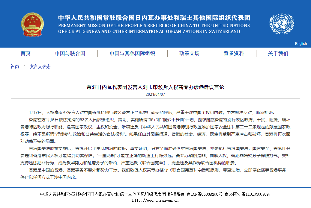 香港新聞網1月8日電 中國常駐日內瓦代表團網站1月7日消息,常駐日內瓦代表團發言人劉玉印日前駁斥人權高專辦涉港錯誤言論。 1月7日,人權高專辦發言人對中國香港特別行政區警方正當執法行動妄加評論,嚴重干涉中國主權和內政,中方堅決反對、斷然拒絕。 香港警方1月6日依法拘捕的53名人員涉嫌組織、策劃、實施所謂“35+”和“攬炒十步曲”計劃,圖謀癱瘓香港特別行政區政府,干擾、阻撓、破壞香港特區政府履行職能,危害國家政...