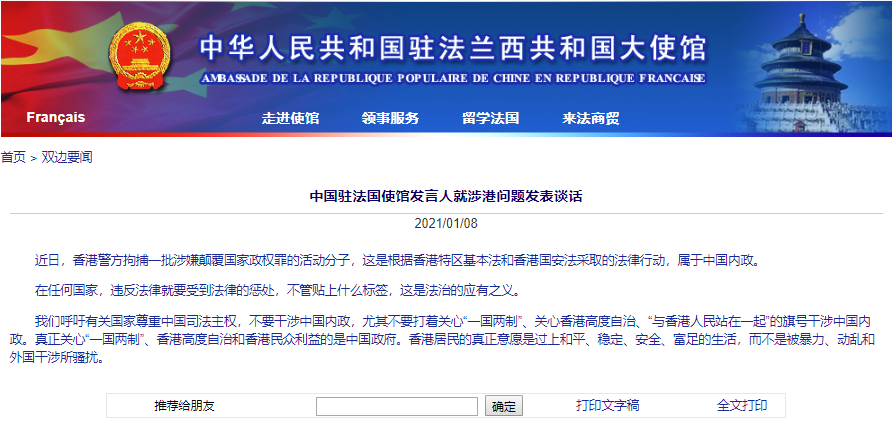 香港新聞網1月8日電 中國駐法國大使館1月8日消息,中國駐法國使館發言人就涉港問題發表談話。 近日,香港警方拘捕一批涉嫌顛覆國家政權罪的活動分子,這是根據香港特區基本法和香港國安法採取的法律行動,屬於中國內政。 在任何國家,違反法律就要受到法律的懲處,不管貼上什麽標簽,這是法治的應有之義。 我們呼籲有關國家尊重中國司法主權,不要干涉中國內政,尤其不要打著關心“一國兩制”、關心香港高度自治、“與香港人民站在一...