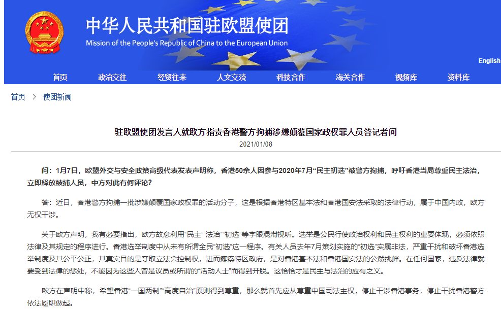 香港新聞網1月8日電 據中國駐歐盟使團網站消息,中國駐歐盟使團發言人就歐方指責香港警方拘捕涉嫌顛覆國家政權罪人員答記者問。 問:1月7日,歐盟外交與安全政策高級代表發表聲明稱,香港50余人因參與2020年7月“民主初選”被警方拘捕,呼籲香港當局尊重民主法治,立即釋放被捕人員,中方對此有何評論? 答:近日,香港警方拘捕一批涉嫌顛覆國家政權罪的活動分子,這是根據香港特區基本法和香港國安法採取的法律行動,屬於中國內...