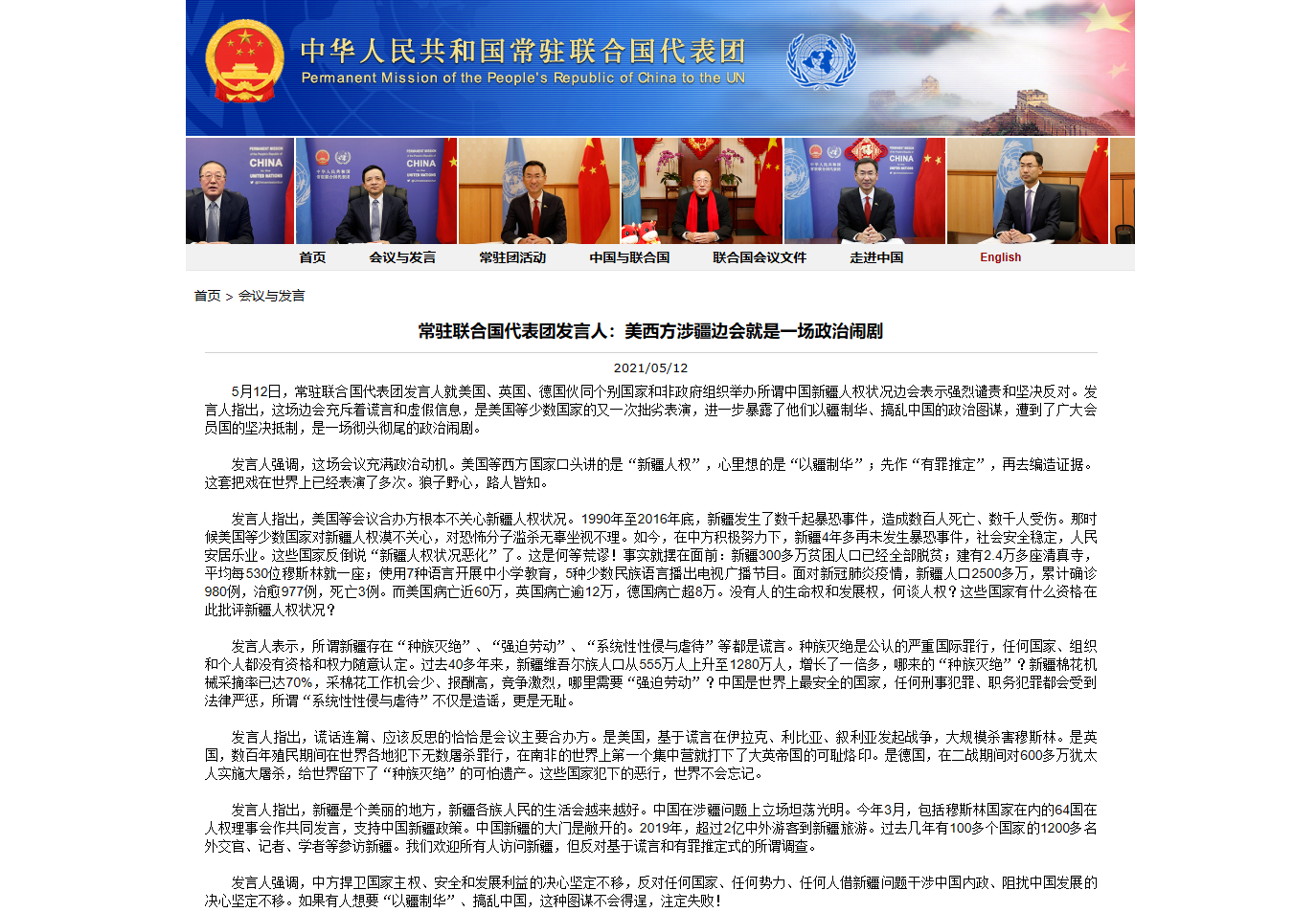 香港新聞網5月13日電 據中國駐聯合國代表團網站12日消息,中國常駐聯合國代表團發言人譴責美西方涉疆邊會就是一場政治鬧劇。 全文如下: 5月12日,常駐聯合國代表團發言人就美國、英國、德國夥同個別國家和非政府組織舉辦所謂中國新疆人權狀況邊會表示強烈譴責和堅決反對。發言人指出,這場邊會充斥著謊言和虛假信息,是美國等少數國家的又一次拙劣表演,進一步暴露了他們以疆制華、搞亂中國的政治圖謀,遭到了廣大會員國的堅決抵制...
