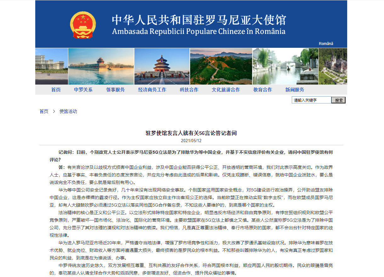 香港新聞網5月13日電 據中華人民共和國羅馬尼亞大使館網站5月12日消息,駐羅使館發言人就有關5G言論答記者問。 記者問:日前,個別政黨人士公開表示羅馬尼亞5G立法是為了排除華為等中國企業,並基於不實信息評價有關企業,請問中國駐羅使館有何評論? 答:有關言論涉及以歧視方式損害中國企業利益,涉及中國企業能否獲得公平公正、開放透明的營商環境,我們對此表示高度關切。作為政界人士,應基於事實、本著負責任的態度發表言論...