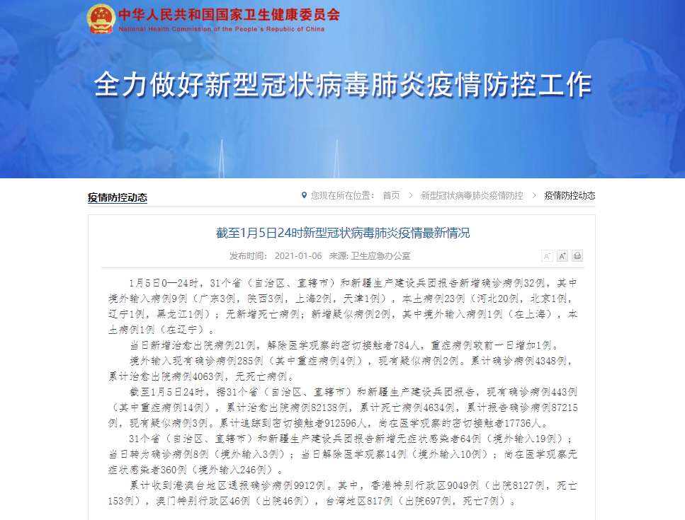 香港新聞網1月6日電 國家衛生健康委員會官方網站1月6日通報,1月5日0—24時,31個省(自治區、直轄市)和新疆生產建設兵團報告新增確診病例32例,其中境外輸入病例9例(廣東3例,陜西3例,上海2例,天津1例),本土病例23例(河北20例,北京1例,遼寧1例,黑龍江1例);無新增死亡病例;新增疑似病例2例,其中境外輸入病例1例(在上海),本土病例1例(在遼寧)。 當日新增治愈出院病例21例,解除醫學觀察的密切...