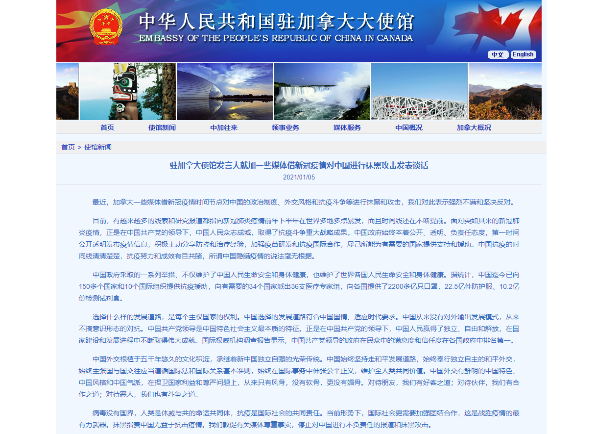 加拿大一些媒體借新冠疫情對中國進行抹黑攻擊,中使館駁斥