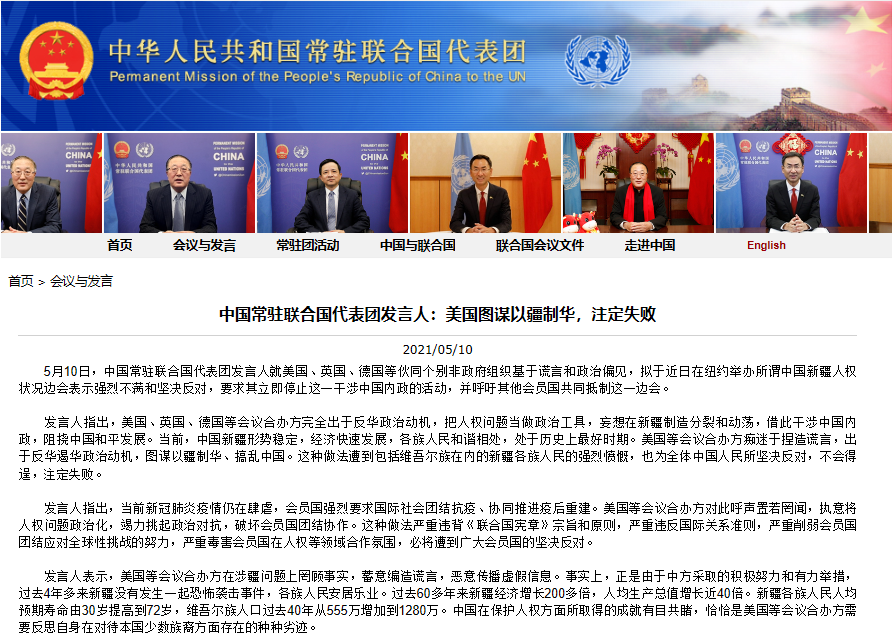 香港新聞網5月11日電 據中國常駐聯合國代表團網站消息,5月10日,中國常駐聯合國代表團發言人就美國、英國、德國等夥同個別非政府組織基於謊言和政治偏見,擬於近日在紐約舉辦所謂中國新疆人權狀況邊會表示強烈不滿和堅決反對,要求其立即停止這一干涉中國內政的活動,並呼籲其他會員國共同抵制這一邊會。 發言人指出,美國、英國、德國等會議合辦方完全出於反華政治動機,把人權問題當做政治工具,妄想在新疆製造分裂和動蕩,借此干涉中...