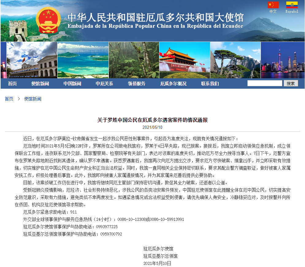 香港新聞網5月11日電 中國駐厄瓜多爾使館網站5月10日發布羅姓中國公民在厄瓜多爾遇害案件的情況通報。 近日,在厄瓜多爾薩莫拉-欽奇佩省發生一起涉我公民惡性刑事案件,引起各方高度關注,現就有關情況通報如下: 厄當地時間2021年5月5日晚22時許,羅某所在公司致電我館稱,羅某於4日早失蹤,現已報案。接報後,我館立即啟動領保應急機制,成立領保聯合工作組,連夜聯系厄外交部、國家警察局、檢察院等有關部門,表達對該案...