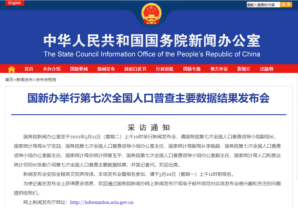 第七次全國人口普查主要數據將於5月11日上午公佈
