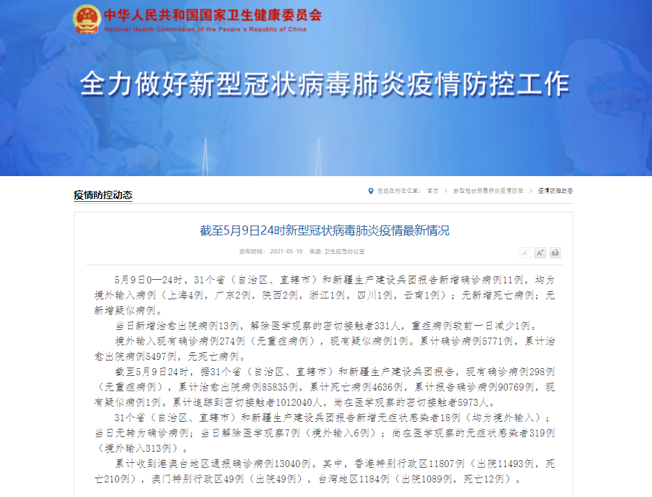 香港新聞網5月10日電 5月9日0—24時,31個省(自治區、直轄市)和新疆生產建設兵團報告新增確診病例11例,均為境外輸入病例(上海4例,廣東2例,陜西2例,浙江1例,四川1例,雲南1例);無新增死亡病例;無新增疑似病例。 當日新增治愈出院病例13例,解除醫學觀察的密切接觸者331人,重癥病例較前一日減少1例。 境外輸入現有確診病例274例(無重癥病例),現有疑似病例1例。累計確診病例5771例,累計治愈出...