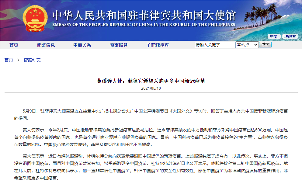 香港新聞網5月10日電 據中國駐菲律賓大使館網站消息,5月9日,駐菲律賓大使黃溪連在接受中央廣播電視總台央廣中國之聲特別節目《大國外交》專訪時,回答了主持人有關中國援菲新冠肺炎疫苗的提問。 黃大使表示,今年2月底,中國援助菲律賓的首批新冠疫苗運抵馬尼拉。迄今菲律賓接收的中方援助和菲方採購中國疫苗已達500萬劑。中國是首個向菲提供疫苗援助的國家,也是首個通過商業渠道向菲提供疫苗的國家。目前,中國科興疫苗已成為菲疫...