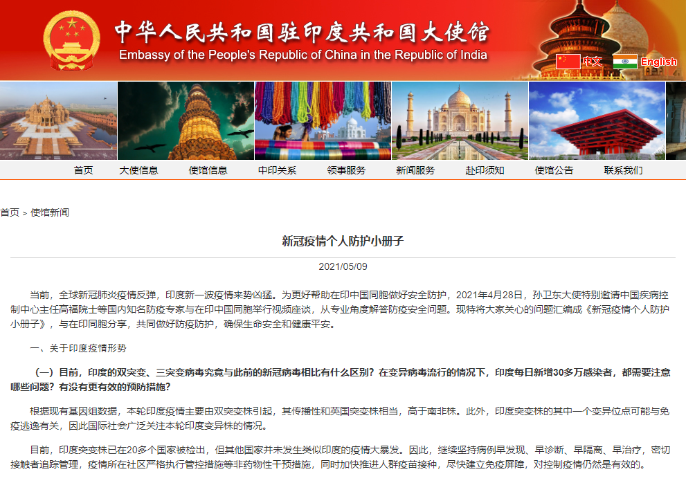 香港新聞網5月10日電 當前,全球新冠肺炎疫情反彈,印度新一波疫情來勢兇猛。據中國駐印度大使館5月9日消息,為更好幫助在印中國同胞做好安全防護,4月28日,孫衛東大使特別邀請中國疾病控制中心主任高福院士等國內知名防疫專家與在印中國同胞舉行視頻座談,從專業角度解答防疫安全問題。現特將大家關心的問題匯編成《新冠疫情個人防護小冊子》,與在印同胞分享,共同做好防疫防護,確保生命安全和健康平安。 一、關於印度疫情形勢 ...