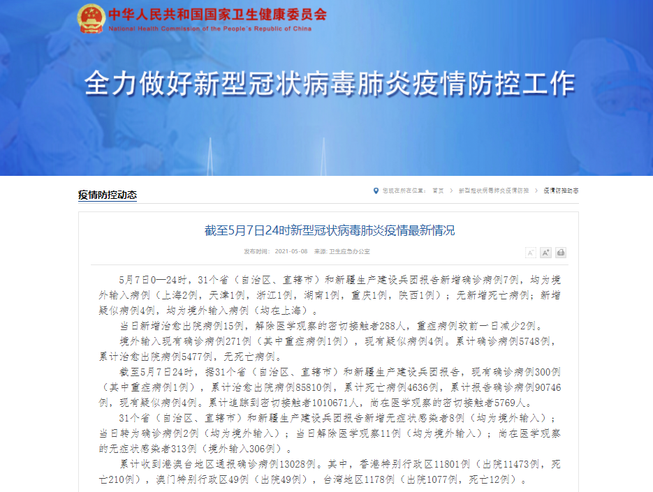 香港新聞網5月8日電 據國家衛生健康委員會官方網站消息,5月7日0—24時,31個省(自治區、直轄市)和新疆生產建設兵團報告新增確診病例7例,均為境外輸入病例(上海2例,天津1例,浙江1例,湖南1例,重慶1例,陜西1例);無新增死亡病例;新增疑似病例4例,均為境外輸入病例(均在上海)。 當日新增治愈出院病例15例,解除醫學觀察的密切接觸者288人,重癥病例較前一日減少2例。 境外輸入現有確診病例271例(其中...