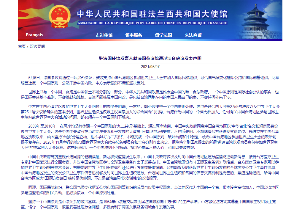 香港新聞網5月8日電 據中國駐法國大使館網站消息,駐法國使館發言人就法國參議院通過涉台決議發表聲明。 全文如下: 5月6日,法國參議院通過一項涉台決議,鼓吹支持中國台灣地區參加世界衛生大會並加入國際民航組織、聯合國氣候變化框架公約和國際刑警組織。此舉明顯違反一個中國原則,公然干涉中國內政,中方表示強烈不滿和堅決反對。 世界上只有一個中國,台灣是中國領土不可分割的一部分,中華人民共和國政府是代表全中國的唯一合...