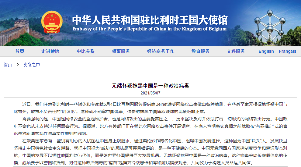 香港新聞網5月8日電 中國駐比利時大使館網站8日刊文稱,近日,比利時一些媒體和專家就5月4日比互聯網服務提供商Belnet遭受網絡攻擊事做出各種猜測,有些甚至毫無根據地懷疑中國與此有關,散布不負責任的“陰謀論”。這種動不動拿中國說事,借影射抹黑中國博取眼球的現象絕非正常。 對此,駐比利時使館表示,中國是網絡安全的堅定維護者,也是網絡攻擊的主要受害國之一,歷來堅決反對並依法打擊一切形式的網絡攻擊行為。中國政府不會...
