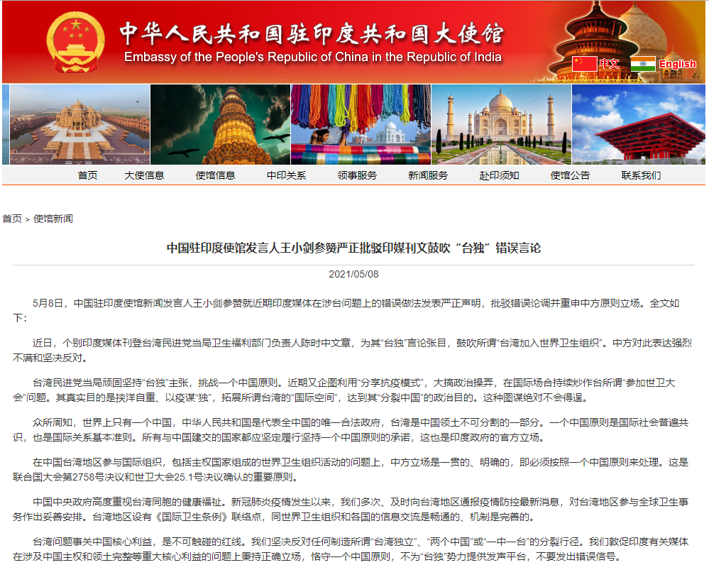 印媒刊文鼓吹“台獨”錯誤言論,中國駐印度使館發言人批駁