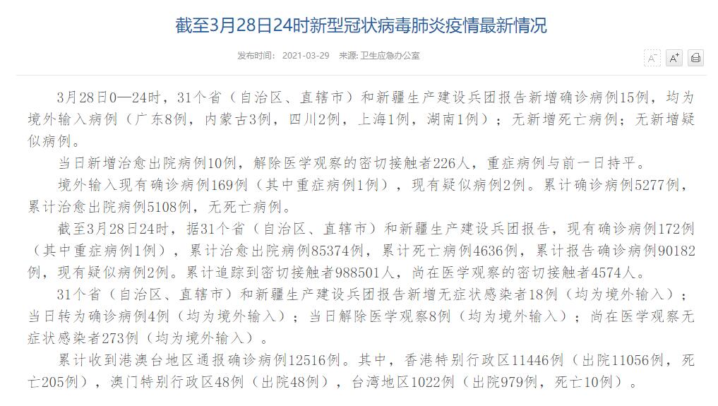 香港新聞網3月29日電 據國家衛健委網站消息,3月28日0—24時,31個省(自治區、直轄市)和新疆生產建設兵團報告新增確診病例15例,均為境外輸入病例(廣東8例,內蒙古3例,四川2例,上海1例,湖南1例);無新增死亡病例;無新增疑似病例。 當日新增治愈出院病例10例,解除醫學觀察的密切接觸者226人,重癥病例與前一日持平。 境外輸入現有確診病例169例(其中重癥病例1例),現有疑似病例2例。累計確診病例52...