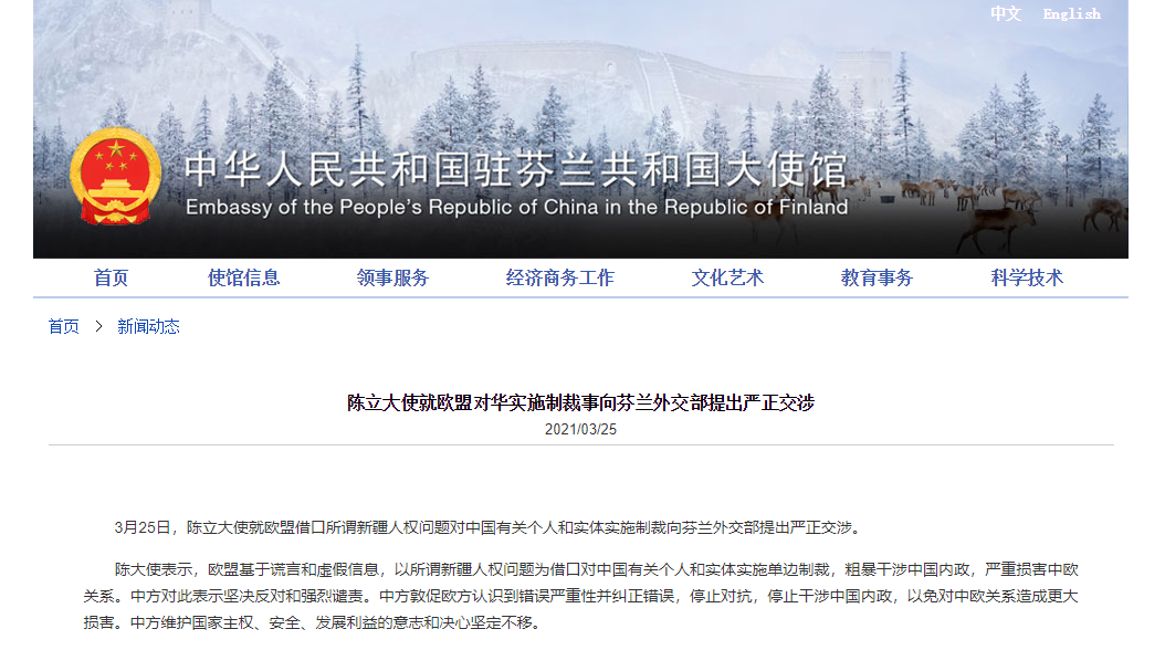 歐盟對華實施制裁,中國駐芬蘭大使向芬蘭外交部提出嚴正交涉