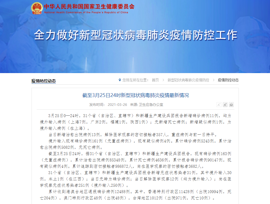 香港新聞網3月26日電 據國家衛生健康委員會官方網站消息,3月25日0—24時,31個省(自治區、直轄市)和新疆生產建設兵團報告新增確診病例11例,均為境外輸入病例(上海7例,廣東2例,福建1例,陜西1例);無新增死亡病例;新增疑似病例1例,為境外輸入病例(在上海)。 當日新增治愈出院病例13例,解除醫學觀察的密切接觸者357人,重癥病例與前一日持平。 境外輸入現有確診病例161例(無重癥病例),現有疑似病例...