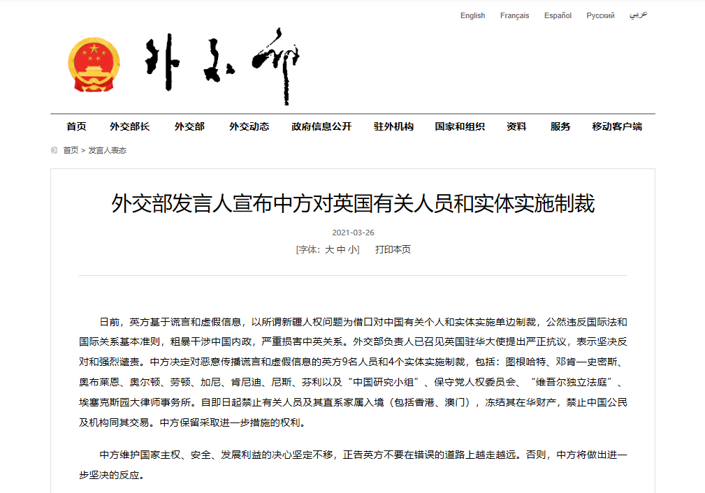 據中國外交部網站26日消息,外交部發言人宣佈中方對英國有關人員和實體實施制裁:日前,英方基於謊言和虛假信息,以所謂新疆人權問題為借口對中國有關個人和實體實施單邊制裁,公然違反國際法和國際關係基本準則,粗暴干涉中國內政,嚴重損害中英關係。外交部負責人已召見英國駐華大使提出嚴正抗議,表示堅決反對和強烈譴責。中方決定對惡意傳播謊言和虛假信息的英方9名人員和4個實體實施制裁,包括:圖根哈特、鄧肯—史密斯、奧布萊恩、奧爾頓...