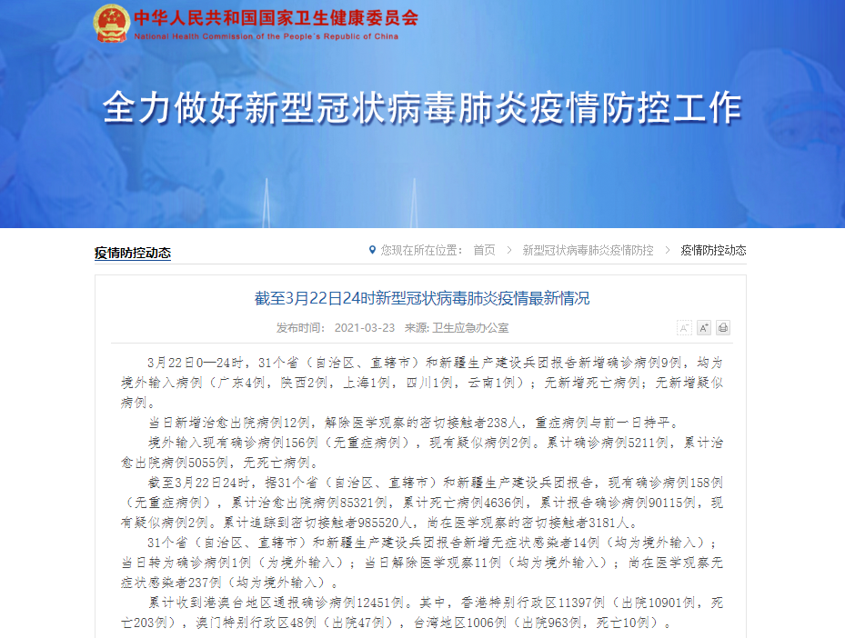國家衛健委:31省新增確診9例,均為境外輸入