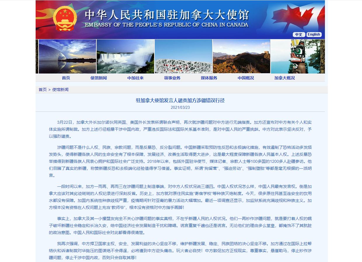 加拿大制裁中方官員,中使館回應:必將遭到中方迎頭痛擊