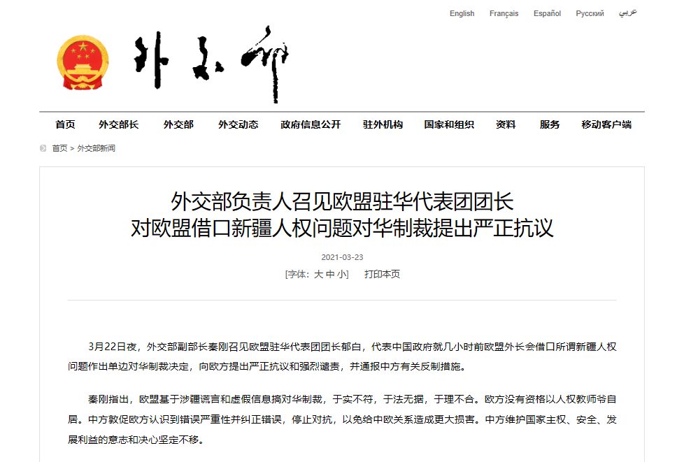 香港新聞網3月23日電 據中國外交部網站消息,3月22日夜,外交部副部長秦剛召見歐盟駐華代表團團長郁白,代表中國政府就幾小時前歐盟外長會借口所謂新疆人權問題作出單邊對華制裁決定,向歐方提出嚴正抗議和強烈譴責,並通報中方有關反制措施。 秦剛指出,歐盟基於涉疆謊言和虛假信息搞對華制裁,於實不符,於法無據,於理不合。歐方沒有資格以人權教師爺自居。中方敦促歐方認識到錯誤嚴重性並糾正錯誤,停止對抗,以免給中歐關係造成更大...
