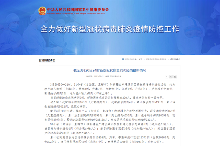 香港新聞網3月21日電 據國家衛生健康委員會官方網站消息,3月20日0—24時,31個省(自治區、直轄市)和新疆生產建設兵團報告新增確診病例12例,均為境外輸入病例(上海4例,甘肅3例,天津2例,內蒙古1例,江西1例,廣東1例);無新增死亡病例;新增疑似病例2例,均為境外輸入病例(均在上海)。 當日新增治愈出院病例9例,解除醫學觀察的密切接觸者370人,重症病例與前一日持平。 境外輸入現有確診病例163例(無...