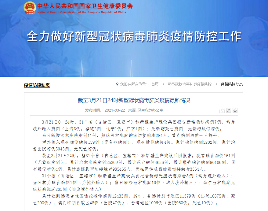 香港新聞網3月22日電 據國家衛生健康委員會官方網站消息,3月21日0—24時,31個省(自治區、直轄市)和新疆生產建設兵團報告新增確診病例7例,均為境外輸入病例(上海3例,福建2例,遼寧1例,廣東1例);無新增死亡病例;無新增疑似病例。 當日新增治愈出院病例11例,解除醫學觀察的密切接觸者284人,重癥病例與前一日持平。 境外輸入現有確診病例159例(無重癥病例),現有疑似病例4例。累計確診病例5202例,...