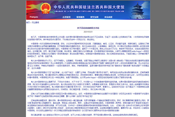 針對一名法國反華學者在社交媒體上惡炒“中國阻止法國議員訪問台灣”一事並艾特中國使館,中國駐法國大使館3月19日發了一條兩個單詞的推文。一些法國媒體因此指責“中國大使館辱罵法國學者”,還有議員稱中國不尊重法國學者的“言論自由”。21日晚,中國大使館發文表示,“言論自由是平等的。他有挑釁中國使館的自由,我們也有回擊他的自由。不能因為戴上一頂學者的帽子就神聖化了,說不得,也碰不得。” 中國大使館的推文只有兩個詞:“p...