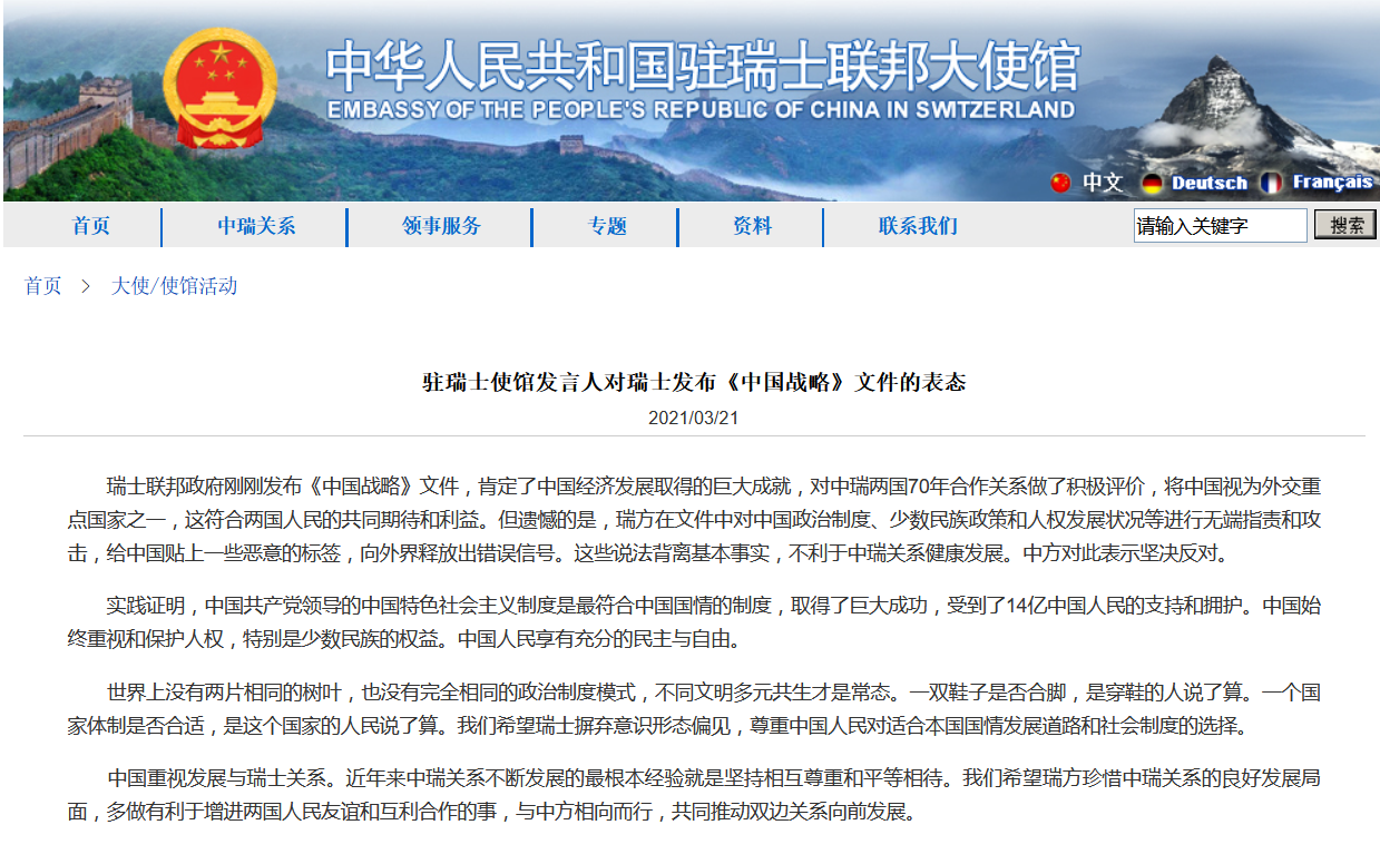 香港新聞網3月22日電 中國駐瑞士大使館網站3月21日發佈《駐瑞士使館發言人對瑞士發佈《中國戰略》文件的表態》,以下為表態全文: 瑞士聯邦政府剛剛發佈《中國戰略》文件,肯定了中國經濟發展取得的巨大成就,對中瑞兩國70年合作關係做了積極評價,將中國視為外交重點國家之一,這符合兩國人民的共同期待和利益。但遺憾的是,瑞方在文件中對中國政治制度、少數民族政策和人權發展狀況等進行無端指責和攻擊,給中國貼上一些惡意的標簽,...