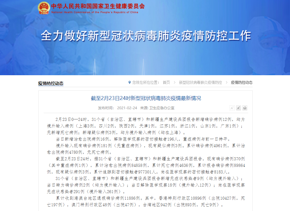 香港新聞網2月24日電 據國家衛健委網站2月24日消息,2月23日0—24時,31個省(自治區、直轄市)和新疆生產建設兵團報告新增確診病例12例,均為境外輸入病例(上海3例,四川2例,陜西2例,天津1例,江蘇1例,浙江1例,山東1例,廣東1例);無新增死亡病例;新增疑似病例3例,均為境外輸入病例(均在上海)。 當日新增治愈出院病例16例,解除醫學觀察的密切接觸者196人,重癥病例與前一日持平。 境外輸入現有確...