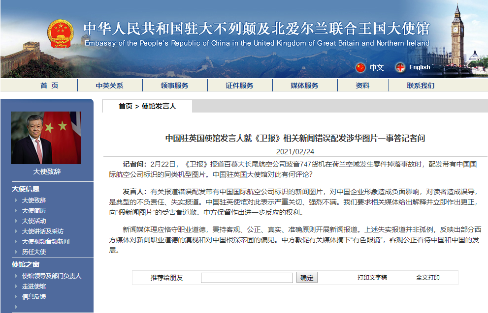 香港新聞網2月24日電 中國駐英國大使館網站2月24日消息,中國駐英國使館發言人就《衛報》相關新聞錯誤配發涉華圖片一事答記者問。 記者問:2月22日,《衛報》報道百慕大長尾航空公司波音747貨機在荷蘭空域發生零件掉落事故時,配發帶有中國國際航空公司標識的同類機型圖片。中國駐英國大使館對此有何評論? 發言人:有關報道錯誤配發帶有中國國際航空公司標識的新聞圖片,對中國企業形象造成負面影響,對讀者造成誤導,是典型的...