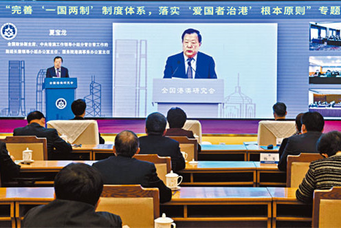 “完善‘一國兩制’制度體系,落實‘愛國者治港’根本原則”專題研討會昨日(2月22日)在北京舉行。全國政協副主席、國務院港澳事務辦公室主任夏寶龍出席開幕式並講話。夏寶龍表示,習近平總書記指出,要確保“一國兩制”實踐行穩致遠,必須始終堅持“愛國者治港”。這一重要論述是對香港回歸以來“一國兩制”實踐經驗的高度提煉,是對“一國兩制”實踐規律的深刻揭示,為推動“一國兩制”實踐行穩致遠、保持香港長治久安指明了方向。夏寶龍表示...