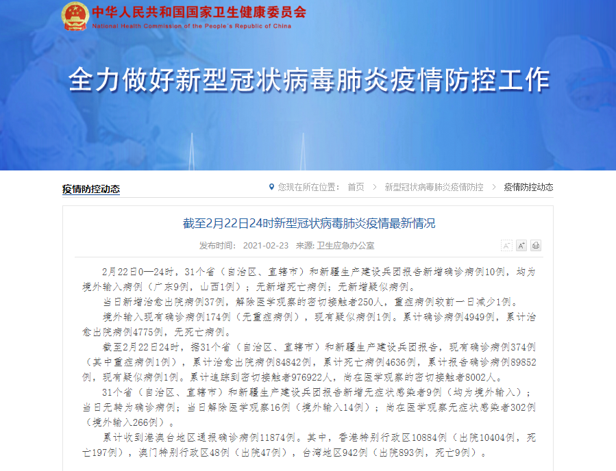 香港新聞網2月23日電 據國家衛生健康委員會官方網站23日消息,2月22日0—24時,31個省(自治區、直轄市)和新疆生產建設兵團報告新增確診病例10例,均為境外輸入病例(廣東9例,山西1例);無新增死亡病例;無新增疑似病例。 當日新增治愈出院病例37例,解除醫學觀察的密切接觸者250人,重癥病例較前一日減少1例。 境外輸入現有確診病例174例(無重癥病例),現有疑似病例1例。累計確診病例4949例,累計治愈...