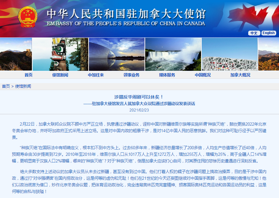 香港新聞網2月23日電 據中國駐加拿大使館網站23日消息,2月22日,加拿大聯邦眾議院不顧中方嚴正立場,執意通過涉疆動議,誣稱中國對新疆維吾爾族等實施所謂“種族滅絕”,鼓吹更換2022年北京冬奧會舉辦地,並呼籲加政府正式採用上述立場。這是對中國內政的粗暴干涉,是對14億中國人民的惡意挑釁。我們對這種可恥行徑予以嚴厲譴責。 “種族滅絕”在國際法中有明確定義,根本扣不到中方頭上。過去60多年來,新疆經濟總量增長了2...
