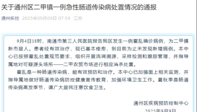 中國江蘇省南通市通州區疾病預防控制中心微信公眾號“通州疾控”9月9日發布通報稱:9月4日,南通市第三人民醫院報告通州區發生一例霍亂確診病例,為二甲鎮新市居人。