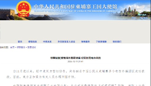 據中國駐柬埔寨大使館11日晚消息,自11月底以來,經中柬雙方密切協作,共有46名中國公民從柬埔寨多個電信詐騙園區成功獲救。目前,柬方正加緊為有關人員辦理回國手續。