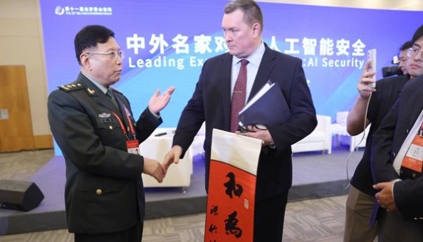 9月12日,北京香山論壇舉行“中外名家對話:人工智能安全”專場對話活動。在中場休息時,中國軍事科學院前副院長何雷中將向參與對話的美國前助理國防部長幫辦施燦德送上一副中國書法條幅,上面寫著三個大字:“和為貴”。