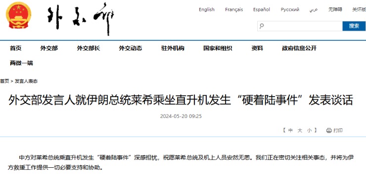 據中國外交部網站5月20日消息,中國外交部發言人就伊朗總統萊希乘坐直升機發生“硬著陸事件”發表談話。