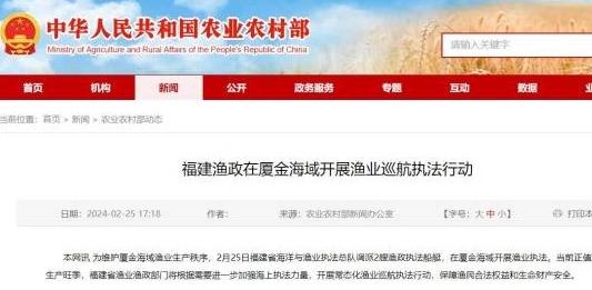 據中國農業農村部網站消息,為維護廈金海域漁業生產秩序,2月25日福建省海洋與漁業執法總隊調派2艘漁政執法船艇,在廈金海域開展漁業執法。當前正值漁業生產旺季,福建省漁業漁政部門將根據需要進一步加強海上執法力量,開展常態化漁業巡航執法行動,保障漁民合法權益和生命財產安全。 (完)