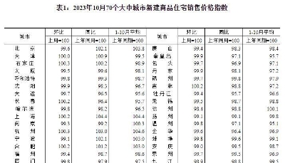 據中國國家統計局網站消息,國家統計局16日公佈2023年10月份70個大中城市商品住宅銷售價格變動情況。數據顯示,10月份,70個大中城市商品住宅銷售價格環比下降城市個數略增,各線城市商品住宅銷售價格環比下降、同比漲跌互現。
