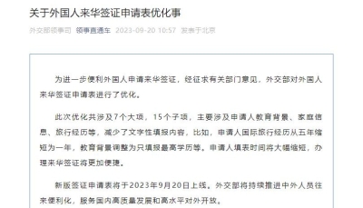 中國外交部優化外國人來華簽證申請表,涉及7個大項