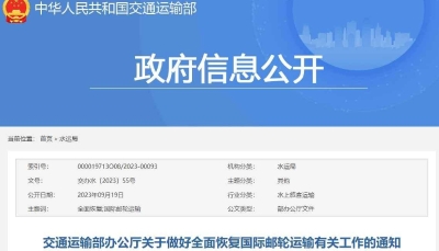 9月19日,中國交通運輸部辦公廳發佈關於做好全面恢復國際郵輪運輸有關工作的通知,在上海、深圳郵輪港口試點恢復國際郵輪運輸的基礎上,經商有關部門,決定自本通知發佈之日起,全面恢復進出中國境內郵輪港口的國際郵輪運輸。