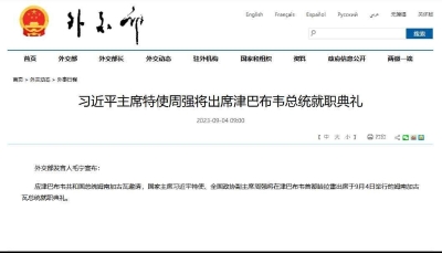 中國外交部發言人毛寧4日宣布:應津巴布韋共和國總統姆南加古瓦邀請,國家主席習近平特使、全國政協副主席周強將在津巴布韋首都哈拉雷出席於9月4日舉行的姆南加古瓦總統就職典禮。