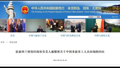 據中國駐新西蘭大使館網站8月4日消息,近日,中國駐新西蘭大使館收悉新西蘭有關媒體關於中國來新務工人員的問詢,中國駐新西蘭大使館經商處負責人就此回應如下: