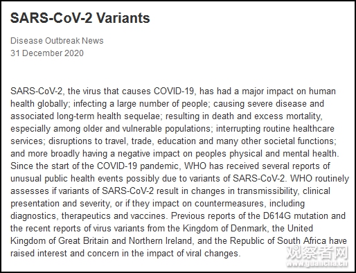 當地時間2020年12月31日晚,世衛組織正式通報了新冠病毒自出現以來的主要變異情況,包括四種變體。 2020年1月底至2月初,新冠病毒出現D614G突變,隨後逐漸取代了最初發現的毒株。到2020年6月,該變體成為全球範圍內主要傳播的新冠病毒類型。研究表明,與初始毒株相比,該變體的感染性和傳播能力都更高,但不會引起更嚴重的疾病,也不會影響現有的診斷、治療、疫苗和公共衛生措施的有效性。 2020年8至9月,丹麥...