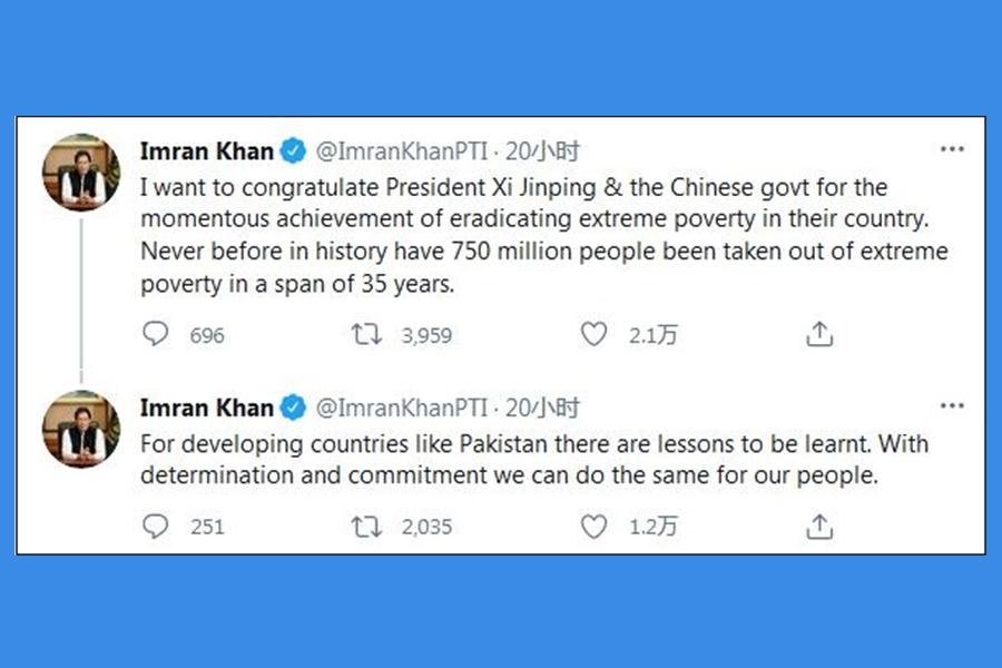 “歷史上從沒有7.5億人能在35年時間裏擺脫絕對貧困。” 當地時間2月28日,巴基斯坦總理伊姆蘭·汗在推特上點贊中國的脫貧攻堅成就,他除了祝賀中國政府的這一壯舉外,還認為像巴基斯坦這樣的發展中國家應該學習中國經驗。 中國外交部發言人汪文斌3月1日回應稱,中國的脫貧成績屬於中國,也屬於世界。從理論和實踐上,為促進國際減貧事業發展提供了中國方案。 汗在推特上表示:“我想祝賀習近平主席和中國政府在消除極端貧困方面...